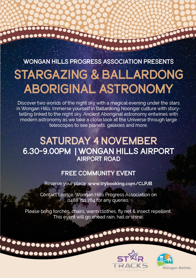 This event is made possible by the Wongan Hills Progress Assocaition and the Shire of Wongan-Ballidu. It is part of the Astrotourism WA project that’s promoting Wongan Hills as a destination for stargazing and astrophotography.